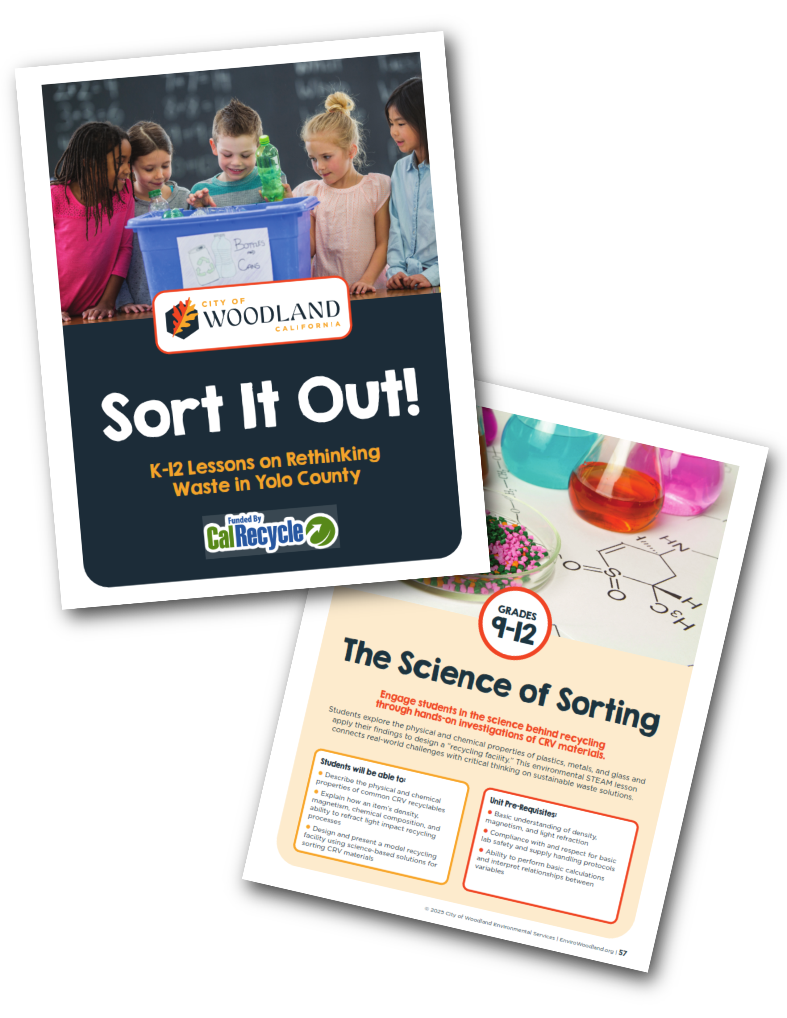 Sort It Out: K-12 Lessons on Rethinking Waste in Yolo County is a free, locally tailored curriculum designed to teach students how to properly sort waste, understand California’s recycling laws, and explore the science and systems behind waste reduction in Yolo County. The guide supports classroom, homeschool, and informal educators with hands-on, grade-specific lessons that align with state NGSS and environmental literacy goals.